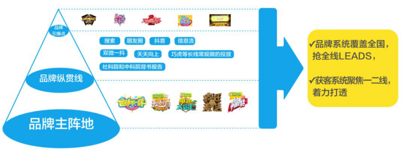 简言之,就是以客厅电视广告为品牌主阵地,选择覆盖全人群全国性的综艺节目投放,同时配合搜索引擎、朋友圈、双微一抖等品牌纵贯线,再加上特殊时点和时间的品牌引爆点营销,形成三角锥式的营销模型。