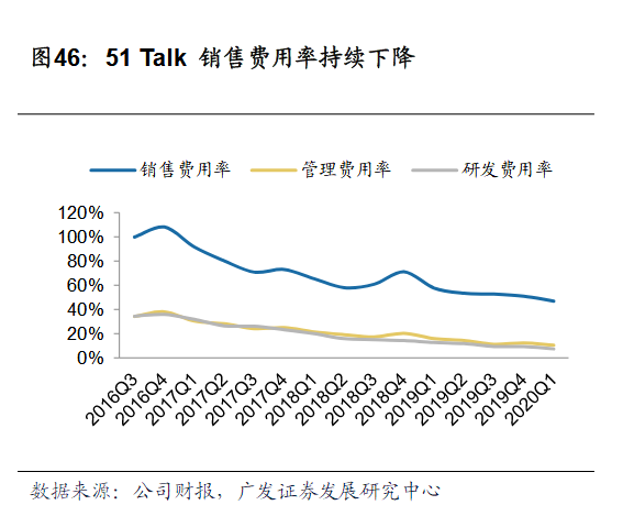 广发证券今年7月发布的研报显示,目前,在线一对一头部公司领先地位逐步强化,行业集中度提升,获客成本相对行业整体已经逐渐下降,实现盈利可期。其中,“51 Talk从19年Q4起Non GAAP口径实现盈利。2020Q1的Non GAAP净利润为5699万元,Non GAAP净利率为11.7%。近年来公司控费水平持续优化,2020Q1销售费用率已经降至47%。 ”