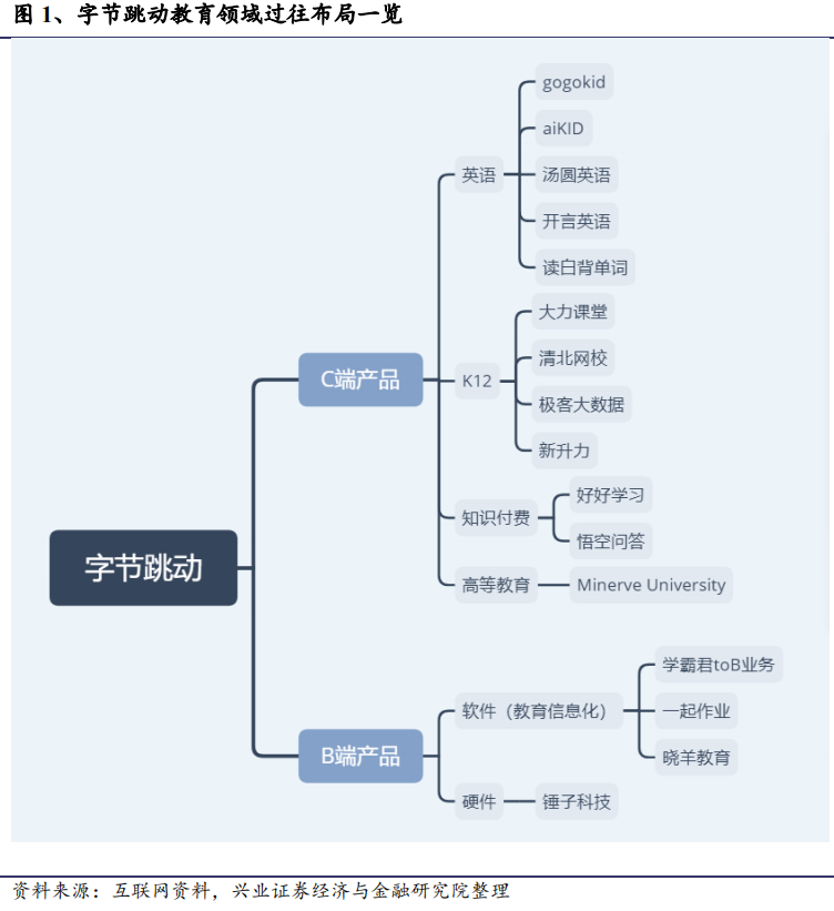 字节跳动在2017年才开始试水孵化第一款教育产品,几个月后,又推出了在线英语学习平台gogokid,请来章子怡代言,不过,gogokid在发布一年左右就传出大规模裁员的消息。目前其旗下B端和C端产品覆盖了英语培训、k12、知识付费、高等教育、教育信息化等多个方面。
