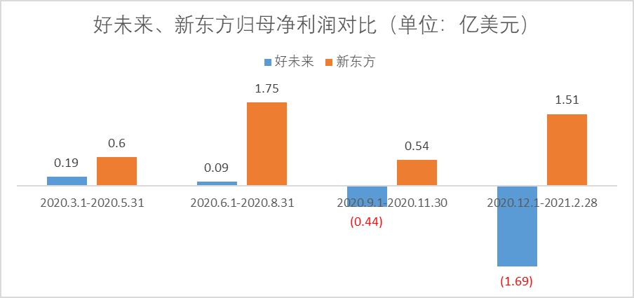 从财报提供的数据来看,新东方正在疫情之后缓慢复苏,净收入和净利润都出现较好的增长势头,而好未来在快速扩张的同时,却难逃亏损。