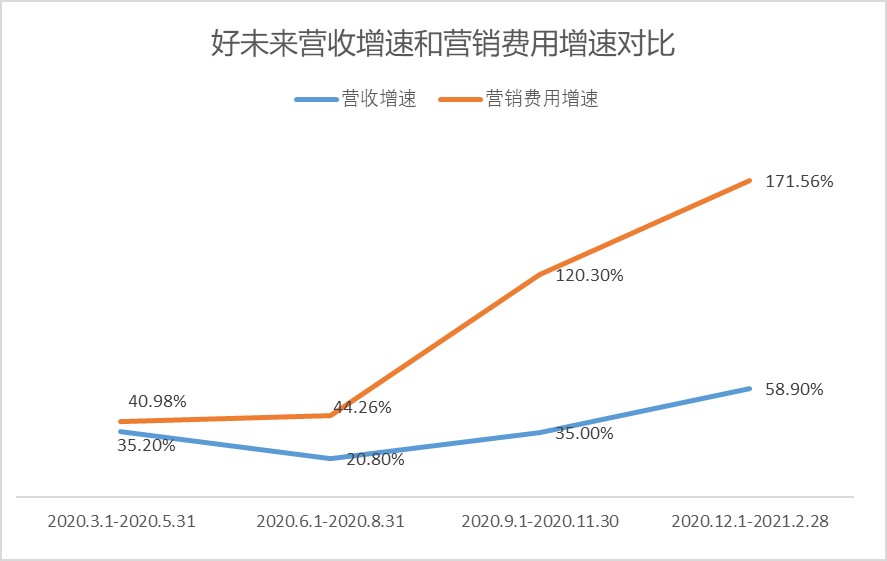 在2021财年第四季度,好未来的营销费用为6.61亿美元,同比增长171.6%,远高于其营收增幅。同期,新东方营销费用仅为1.561亿美元,同比增长35.1%。