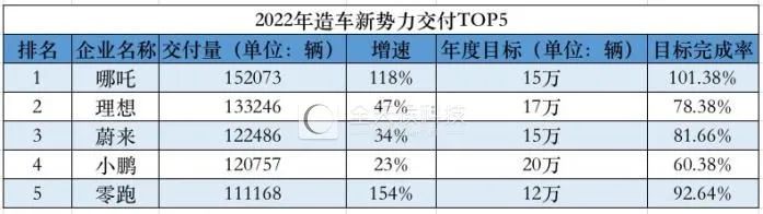 2022年全年,哪吒、理想、蔚来夺得前三,交付量分别为15.2万辆、13.3万辆和12.2万辆。小鹏下滑至第4,共交付约12.1万辆;零跑位居第5,交付量为11.1万辆,但增速达到154%,为前五增速最快车企。