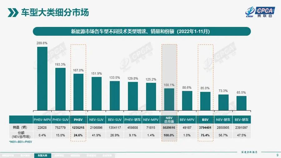 2022年1-11月,插混车型销量为123.5万辆,虽然仅占据新能源汽车总销量24.6%的份额,但增速高达167.0%,远超纯电动的85.0%。