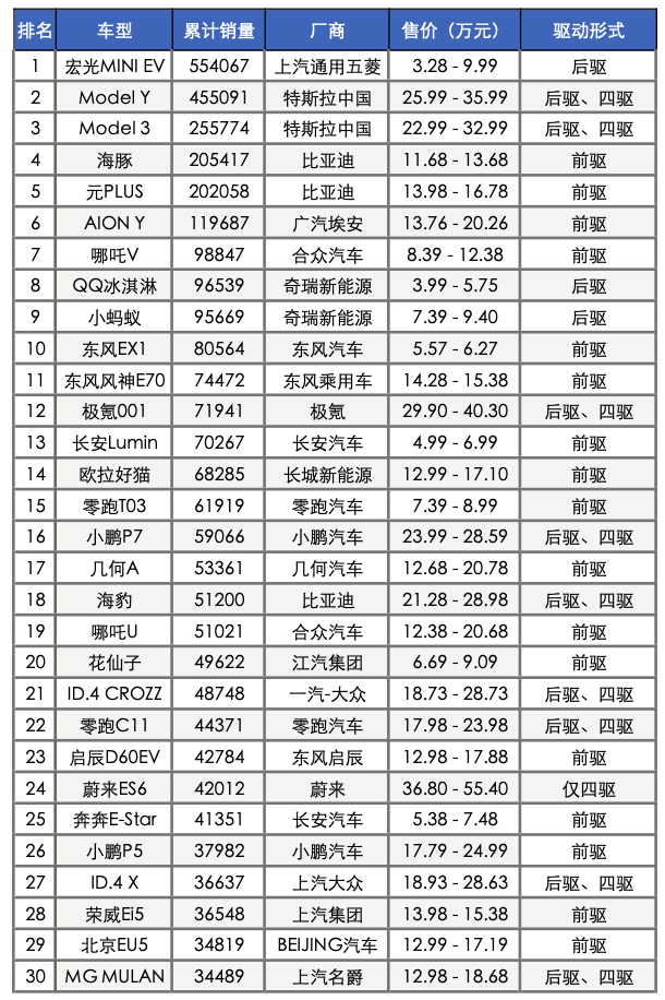 笔者对2022年中国市场销量排名前三十的纯电动车驱动形式,做了一个统计:“后驱(含四驱)”的总共12款,“前驱”的17款,仅“四驱”的1款(蔚来ES6)。