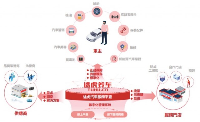 途虎养车定位为“线上线下一体化汽车服务平台”。成立于2011年的途虎养车最初是一个纯粹的线上零售平台,为客户提供多种正品汽车产品,而后逐步建立了一个由门店和技师组成的线下网络,以提供标准化的店内服务。