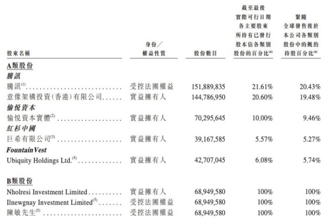 途虎养车在上市前的股东架构中, 控股股东陈敏持有全部B类股份及部分A类股份,持股10.00%,拥有48.98%的投票权。IPO后,腾讯、愉悦资本、红杉中国、 FountainVest,分别持有约20.43%、9.46%、5.27%及5.74%途虎养车股份。腾讯是最大机构股东。