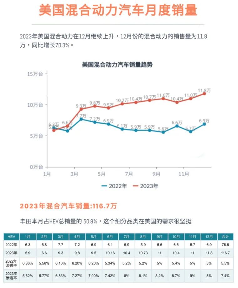 2023年美国市场的混合动力汽车销量较2022年同期明显上升,单看2023年12月的销售量已经达到11.77万辆,同比增长达到惊人的70.3%。丰田汽车毫无疑问的占据了美国混动汽车市场的主导地位,销售占比超过50%。