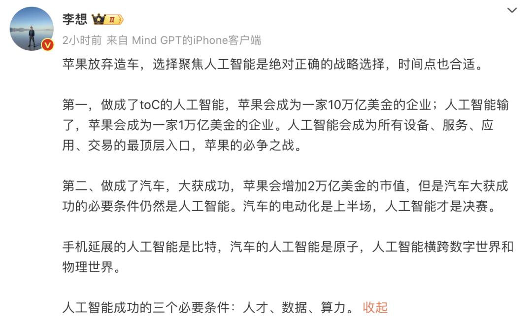 在这种情况下,苹果放弃造车的消息就显得既出人意料,又合情合理了。毕竟苹果在造车这件事上左右摇摆,早已错失先机,而可以成为所有设备、服务、应用、交易顶层入口的人工智能才是更符合苹果企业定位的战略重点。
