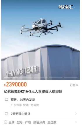真正面向更为广泛的C端群体,或随着续航里程和安全性能提升,规模量产带来成本曲线的下降一步步实现,两百多万的价格挂在淘宝上的初衷可能并不是为了卖货,而是借助一个国民级平台植入未来低空经济的概念。