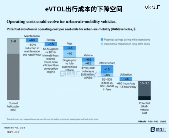 据麦肯锡预计,若eVTOL大规模采用,每可用座英里的运营成本可降低至0.5-2.5美金,远低于目前直升机每可用座英里6-8美元的运营成本。