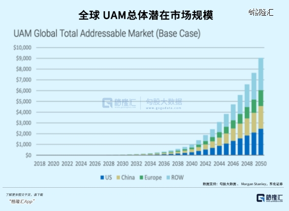 根据罗兰贝格,到2030全球投入商业运营的eVTOL数量将达5千架,2050年达16万架。摩根士丹利预测,到2050年,UAM可触达的全球市场规模将达9万亿美元,中国的潜在市场规模将达到2.1万亿美元。