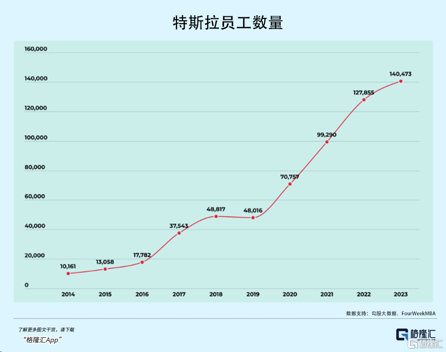但随着全球工厂落地,业务布局相继清晰,克服产能地狱之后,特斯拉的员工人数在过去几年间仍然大幅增长,从2018年初的4.8万人增加到2024年初的14万人。