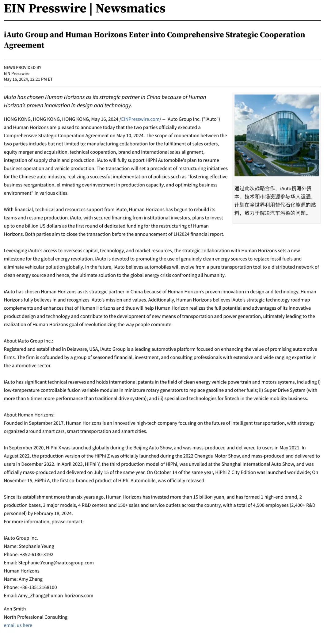 据电车场消息,高合汽车的母公司华人运通,于5月10日与汽车投资咨询平台iAuto在香港签署了全面战略合作协议。