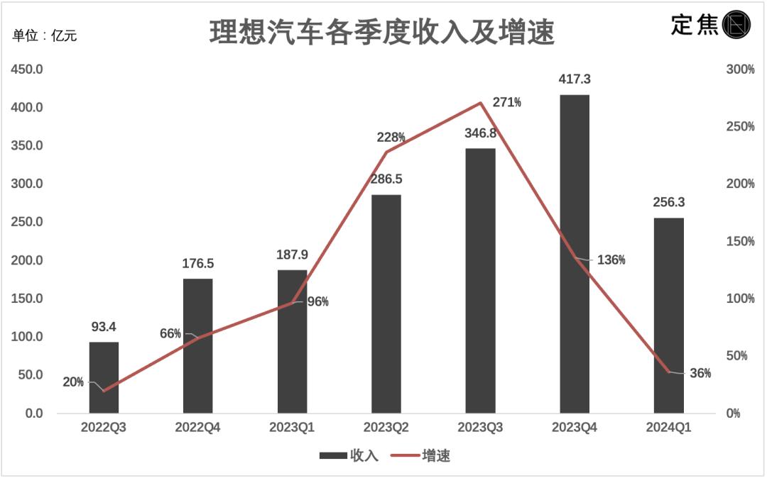 这让理想的收入增速,从百分比前遥遥领先的三位数,降到了36%——一季度收入256.3亿元,近四个季度最低。