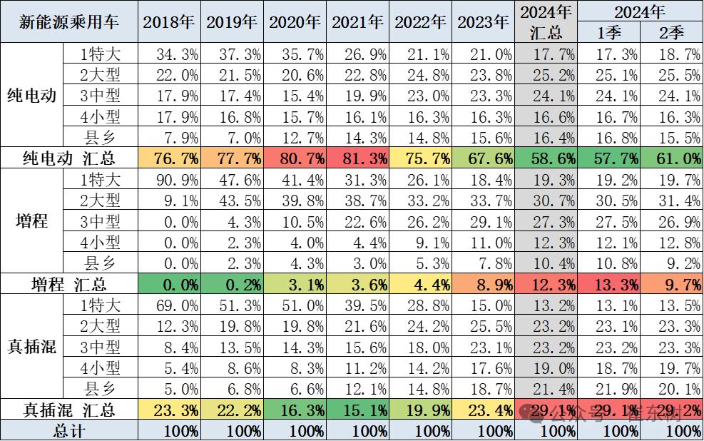 中国乘联会秘书长崔东树披露的数据显示,国内小城县乡新能源汽车的销售结构纯电车销售占比从2020年的90%下降到2024年的57%,和大城市有逐步接近的特征。纯电正以每年11%的速度下滑,插电混动则以每年8%的速度上涨。