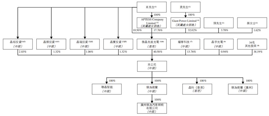 招股书显示,肖先生、陈先生和袁先生、APTESS、GiantPower、微晶先进光电、晶裕投资、晶领投资、晶瑞投资及晶实投资连同劳女士(由于其与陈先生的配偶关系)构成一致行动人士集团。截至最后实际可行日期,一致行动人士集团合计直接及间接持有晶科电子约47.11%的股本。