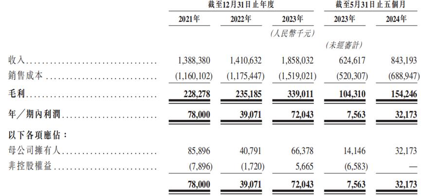财务方面,2021年、2022年、2023年及2024年1-5月(简称“报告期”),公司收入分别为13.88亿元、14.11亿元、18.58亿元、8.43亿元;同期净利润分别为7800万元、3907万元、7204万元、3217万元;毛利率分别为16.4%、16.7%、18.2%、18.3%。