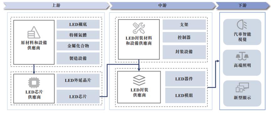LED智能视觉产业链可分为三个部分:上游,包括LED芯片等原材料;中游,包括LED器件和模块;及下游,主要包括汽车智能视觉、高端照明和新型显示三大应用场景。下图列示LED智能视觉市场产业链: