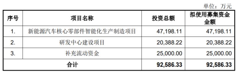 本次申请上市,富特科技拟募集资金用于新能源汽车核心零部件智能化生产制造项目、研发中心建设项目、补充流动资金。