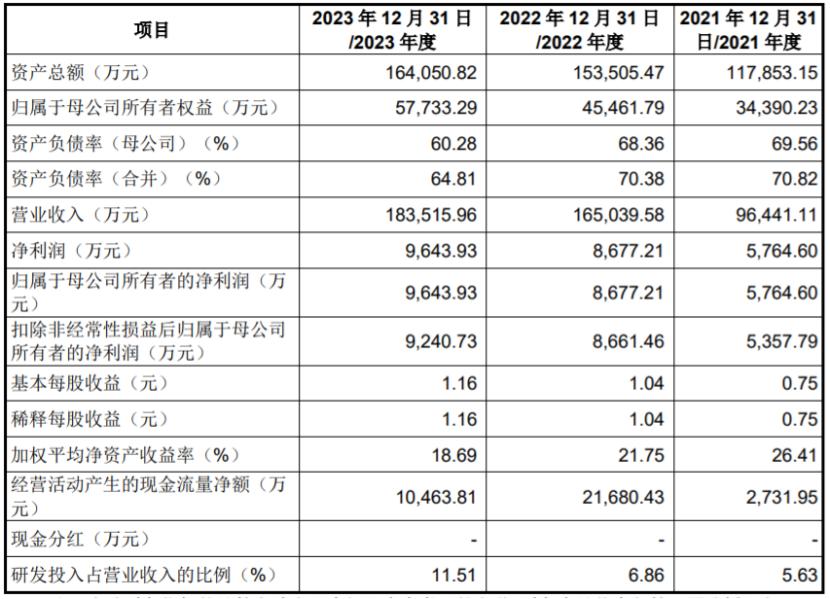 业绩方面,2021年、2022年、2023年,富特科技的营业收入分别约9.64亿元、16.5亿元、18.35亿元,对应的净利润分别为5764.60万元、8677.21万元、9643.93万元,同期主营业务毛利率分别为20.42%、20.47%和24.89%。