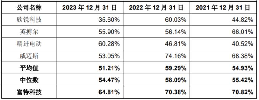 报告期各期末,富特科技的资产负债率分别为70.82%、70.38%和64.81%,尽管有所下降,但仍高于同行业可比公司均值,同时公司流动比率、速动比率低于同行业上市公司平均水平,短期偿债能力有待提高。