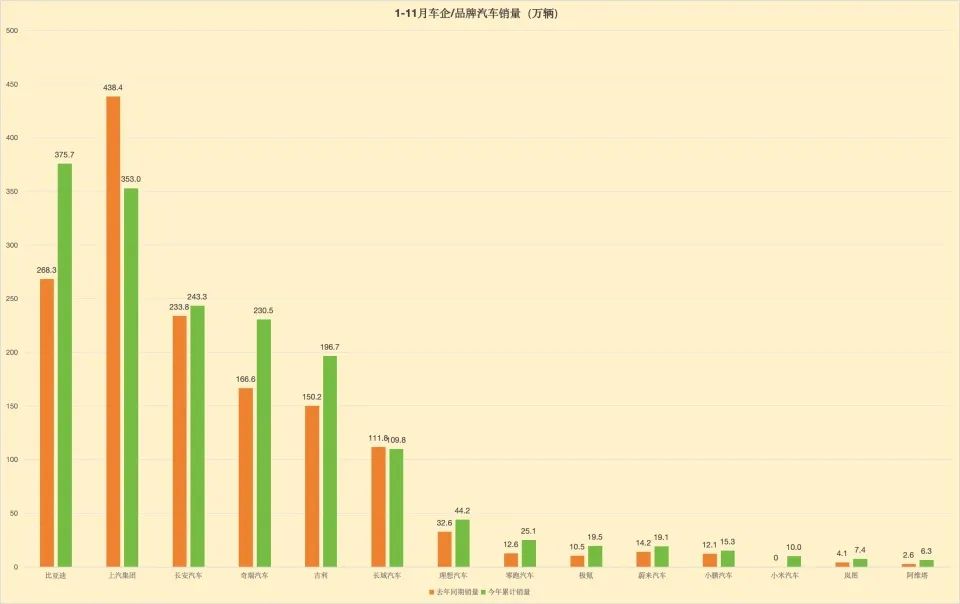 时代财经统计了15家已公布前11个月销量的车企,比亚迪、上汽集团、长安汽车位列销量前三甲。其中,比亚迪今年累计销售375.7万辆汽车,同比增长40.02%,是国内销量最高的车企;不过上汽集团同期销量为353.0万辆,同比下滑19.48%,是本次统计中销量下滑最多的车企集团。