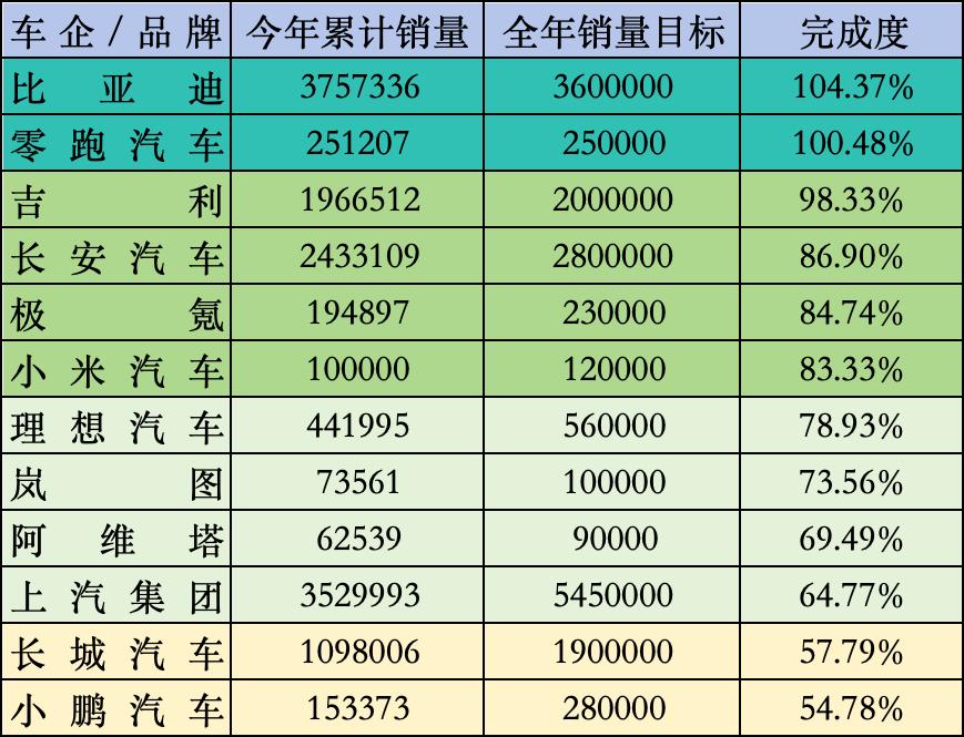 整体而言,随着年末将至,多数主要车企已接近其全年销量目标。比亚迪、零跑汽车已提前完成任务,向着更高数字冲击;吉利汽车、长安汽车、极氪、小米汽车也有望达到目标。值得一提的是,吉利汽车原目标为年销190万辆,后提升至200万辆。