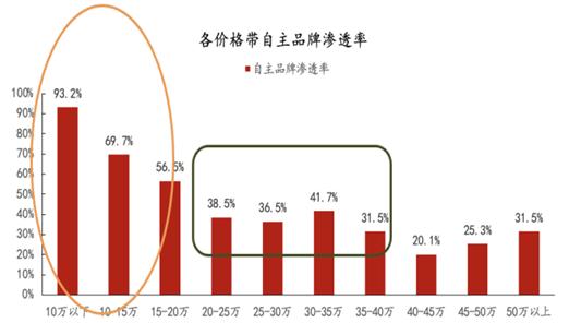 图:中国2024年各价格带自主车企品牌渗透率 资料来源:交强险,方正证券