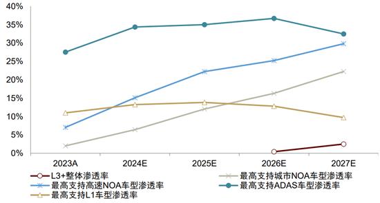 图:乘用车L1-L3+功能渗透率资料来源:高工汽车,中金公司