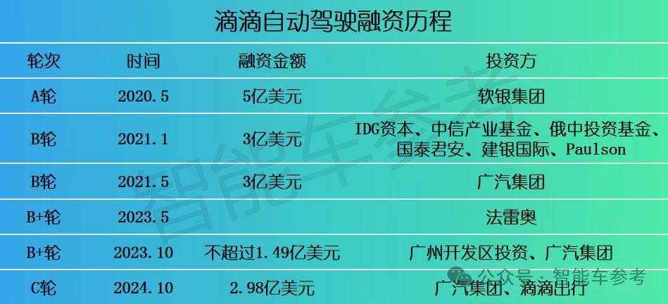加上2024年10月完成的C轮融资,滴滴自动驾驶已累计筹资超15.5亿美元(约112.6亿元),投后估值可能将达到50亿美元(约363亿元)。