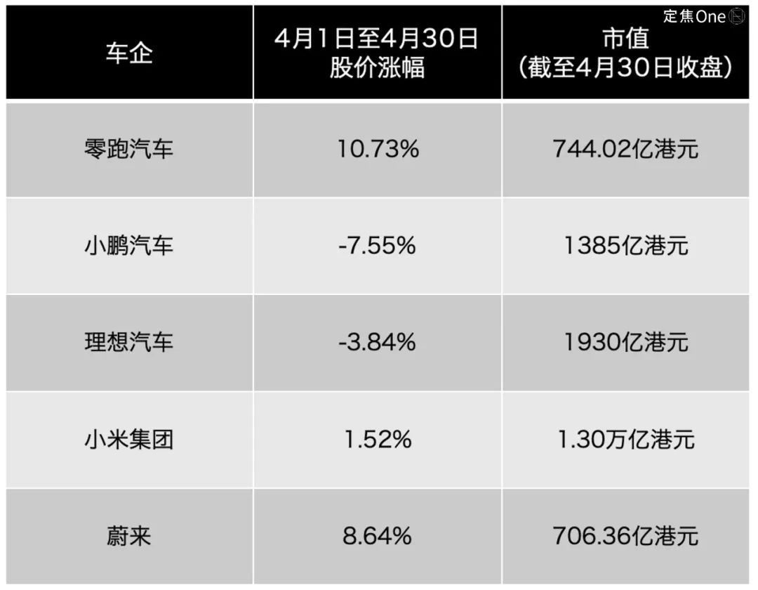 交付量冠军零跑股价涨幅最大(10.7%),市值冲到744亿港元;小米事故带来的短期冲击不可避免,但市场看好生态用户转化的潜力,认为中长期不必过度悲观,4月股价微涨1.5%,市值1.3万亿;