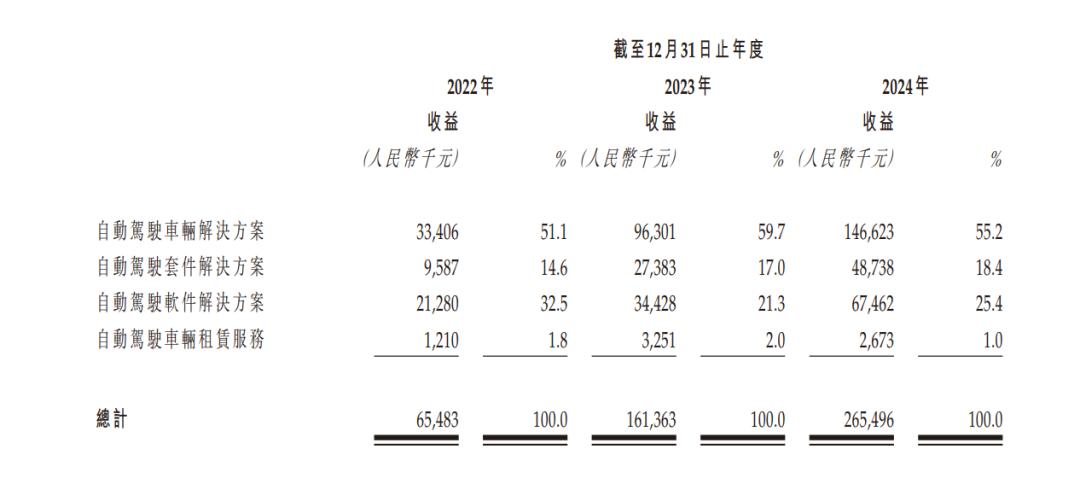 从业务线划分,驭势科技营收主要来自自动驾驶车辆解决方案、自动驾驶套件解决方案、自动驾驶软件解决方案、及自动驾驶车辆租赁服务。2022年、2023年 及2024年,驭势科技收入的一半以上来自自动驾驶车辆解决方案,收入分别为3340.6万元、9630.1万元及1.47亿元,营收占比分别为51.1%、59.7%及55.2%。