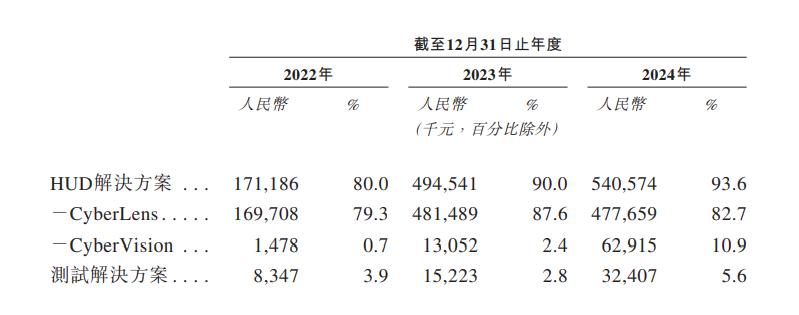 在泽景科技的HUD产品中,又是CyberLens占据收入大头,但占比已开始呈现下滑趋势,而CyberVision则正在飞速攀升,其比重已经从2022年的0.7%,跃升到了2024年的10.9%。