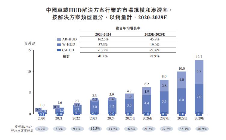 据灼识资料数据,按销售量计,中国车载HUD解决方案的市场规模,由2020的100万台增至2024年的390万台,年复合增长率达到41.2%,预计到2029年将增长到1270万台。