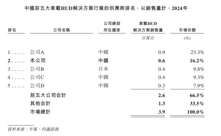 2024年,中国车载HUD解决方案市场中,前五大供应商合计占据市场份额的66.5%,其中有四家都为中国厂商。