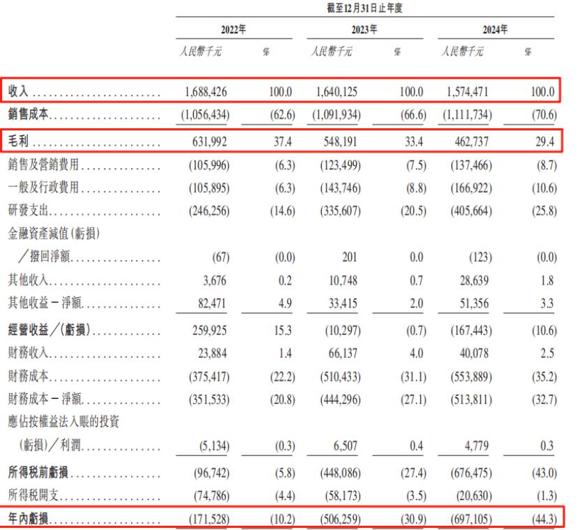 2022年、2023年、2024年(报告期),公司的收入分别为16.88亿元、16.4亿元、15.75亿元,净利润分别为-1.72亿元、-5.06亿元、-6.97亿元,三年累计亏损13.75亿元。