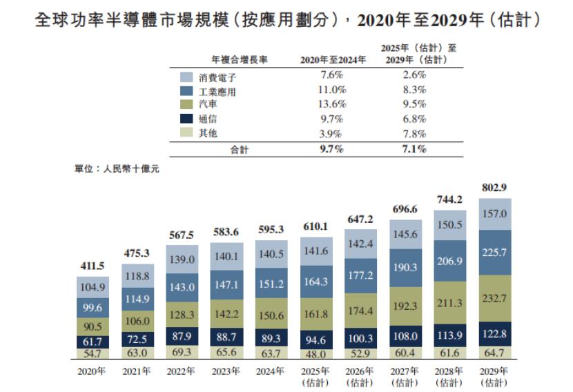 全球功率半导体市场规模(按应用划分),来源:招股书