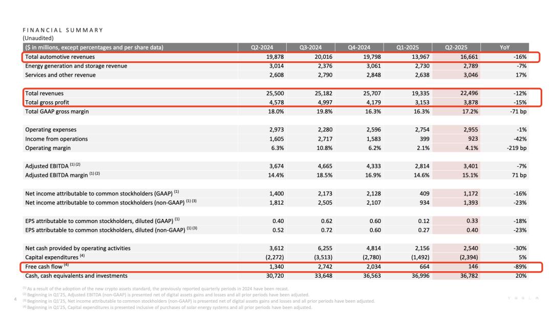 特斯拉 2025 年 Q2 业绩报告核心数据 | 图片来源:特斯拉