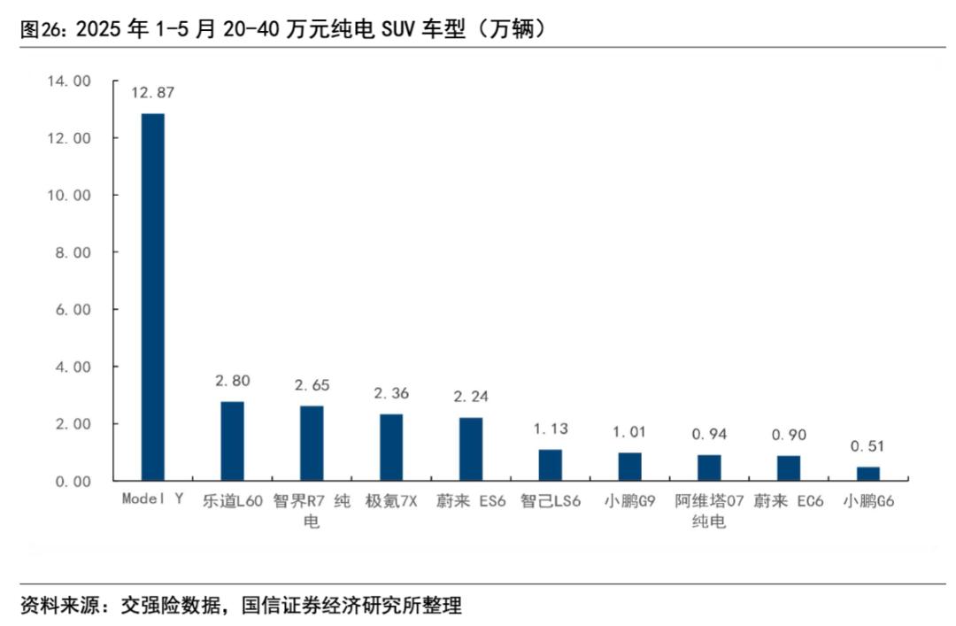 在这个市场里,特斯拉Model Y(2024年全年销量高达48.12万辆)销量领先,其他年销量在10万辆以上的车型还包括问界M7、理想L6、大众探岳、理想L7、CRV、途观L等;在纯电SUV领域有乐道L60、智界R7纯电、极氪7X、蔚来ES6等。