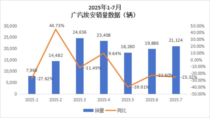 2024年2月,也就是比亚迪出招的当月,埃安销量同比下滑66.74%。埃安立刻推出限时0首付/贴息补贴,尝试挽回局面。到了下个月,埃安销量同比下滑速度确实见缓,不过仍保持30.4%的失速。今年前七个月,埃安仍面临同比16%左右的销量下滑。