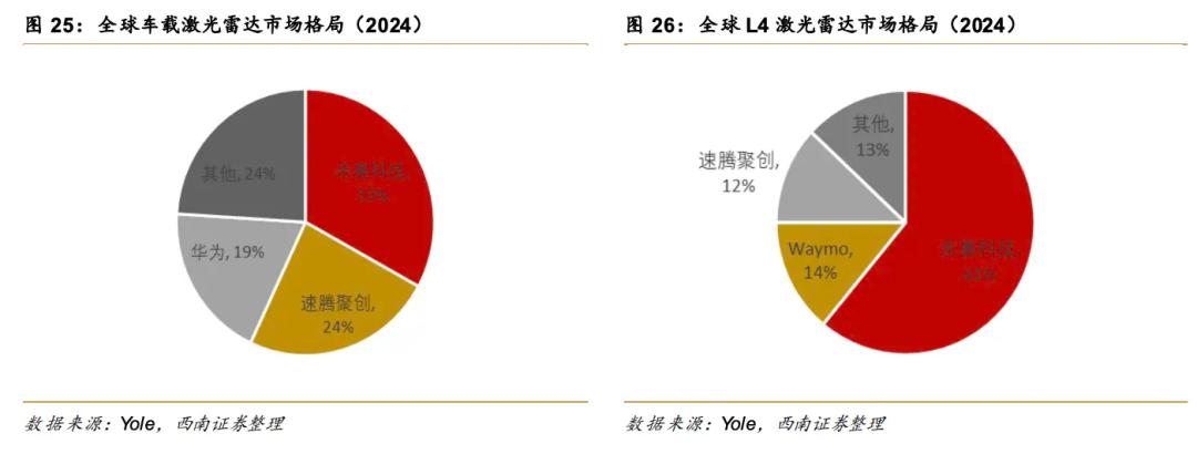 从市场地位看,禾赛确实底气较足。Yole Group数据显示,其在2021-2024年连续四年蝉联全球收入第一。尤其是在高价值的L4自动驾驶市场中,禾赛份额高达61%,连续四年位居榜首,而速腾仅占12%。