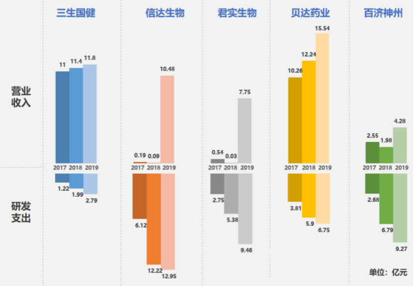 2017至2019年,三生国健营收分别为11亿、11.4亿和11.8亿元,但其研发费用分别为1.22亿元、1.99亿元及2.79亿元。与信达生物、百济神州、君实生物、贝达药业等其他创新型生物药企业相比,其营业收入均高于平均值,但在研发投入上却显得十分吝啬。