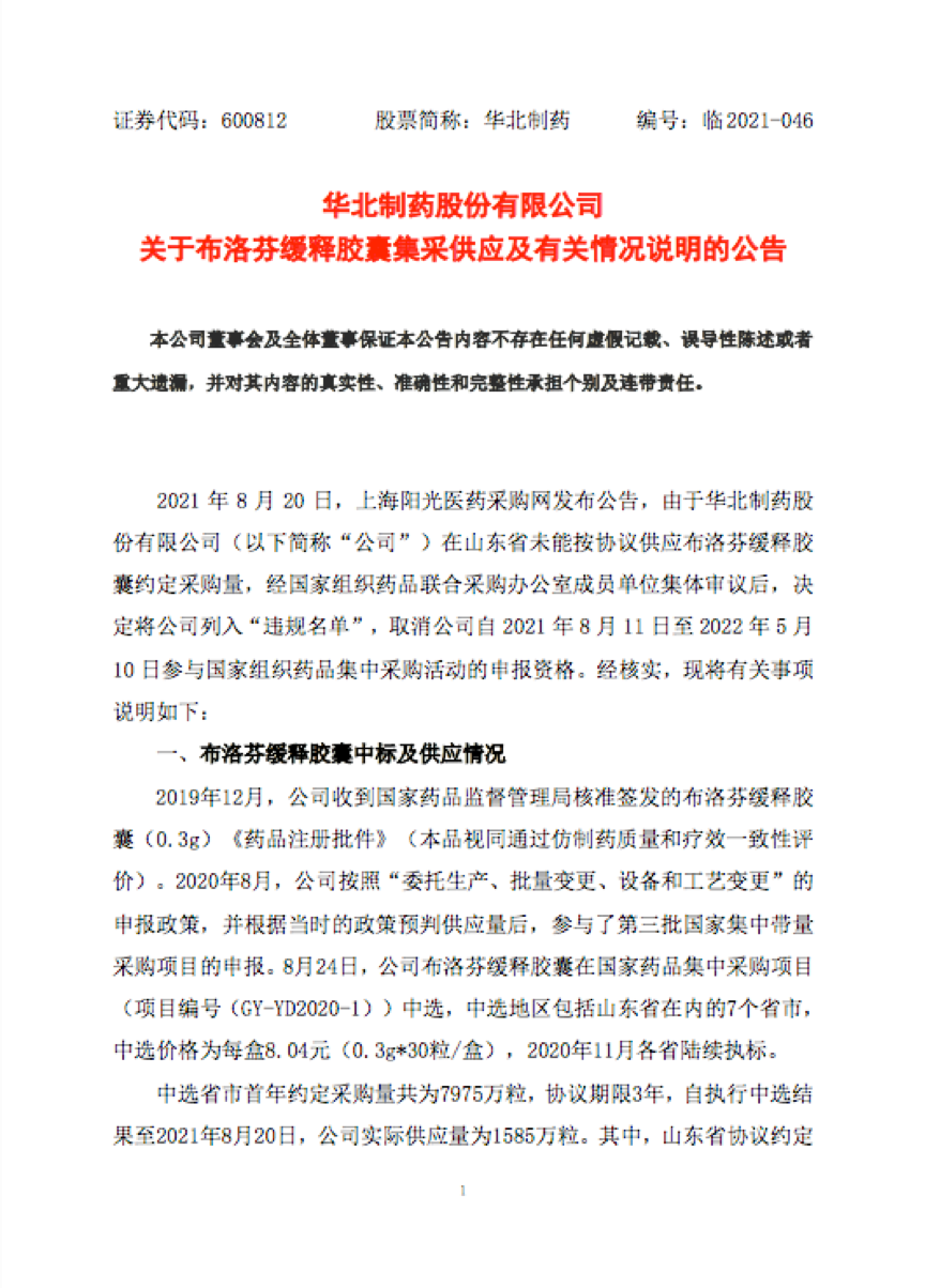 8月20日,国家药品集采中第一家因断供被处罚的企业出现。上海阳光医药采购网发布通知称第三批国家组织药品集中采购品种布洛芬缓释胶囊的中选企业华北制药股份有限公司在山东省未能按协议供应约定采购量,经相关部门多次约谈协商,供应情况仍未改善。根据有关规定,决定将华北制药股份有限公司列入“违规名单”。