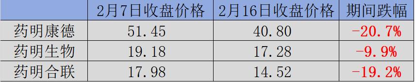 春节期间,药明系三家港股上市公司再次上演暴跌戏码。对比2月7日和2月16日收盘股价,药明康德、药明生物、药明合联股价跌幅分别为20.7%、9.9%、19.2%。