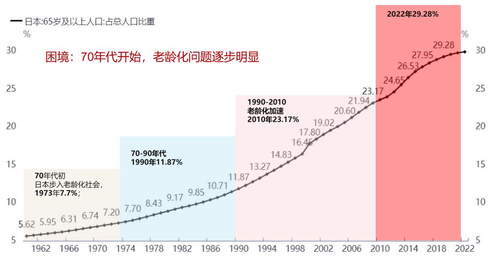• 第一阶段是70年代初,日本开始步入老龄化社会,1973年日本老龄化人口占比达到7.7%。