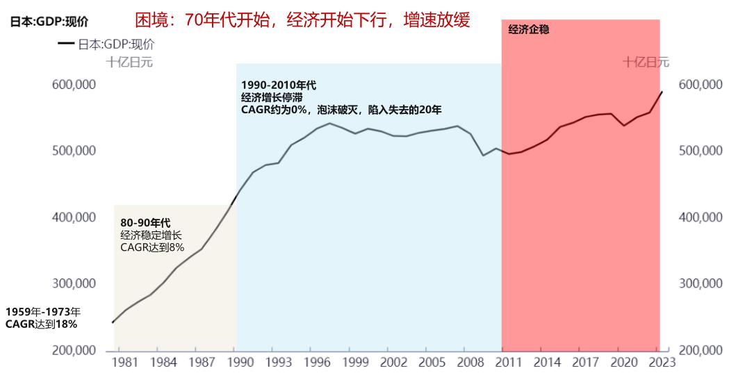 • 第三阶段1990-2010年代尤其值得关注,在这个时期,日本经济增长趋于停滞,CAGR约为0,泡沫破灭,日本陷入失去的20年。