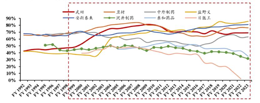 20世纪80年代中期到90年代,受医保控费、国内行业增速有限,且海外MNC进入日本市场、竞争加剧影响,大量日本药企纷纷布局出海战略。