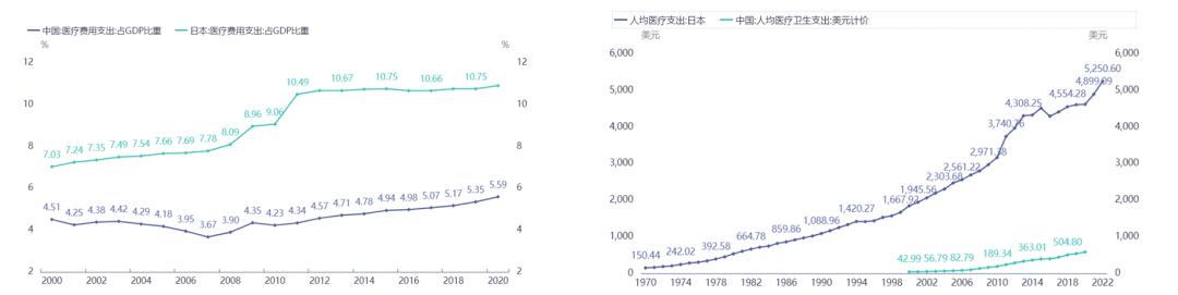 中日医疗费用支出GDP占比及人均医疗支出 来源:同花顺iFinD
