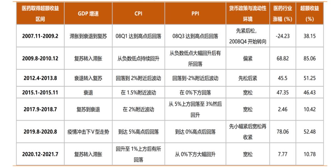 回顾历史,2007年以来,医药板块持续获得6个月以上的超额收益区间有7次,经济周期跨度较大,往往会经历复苏到滞涨再到衰退等多个区间,对应流动性环境也会经历松紧转换,并没有很强的规律性。
