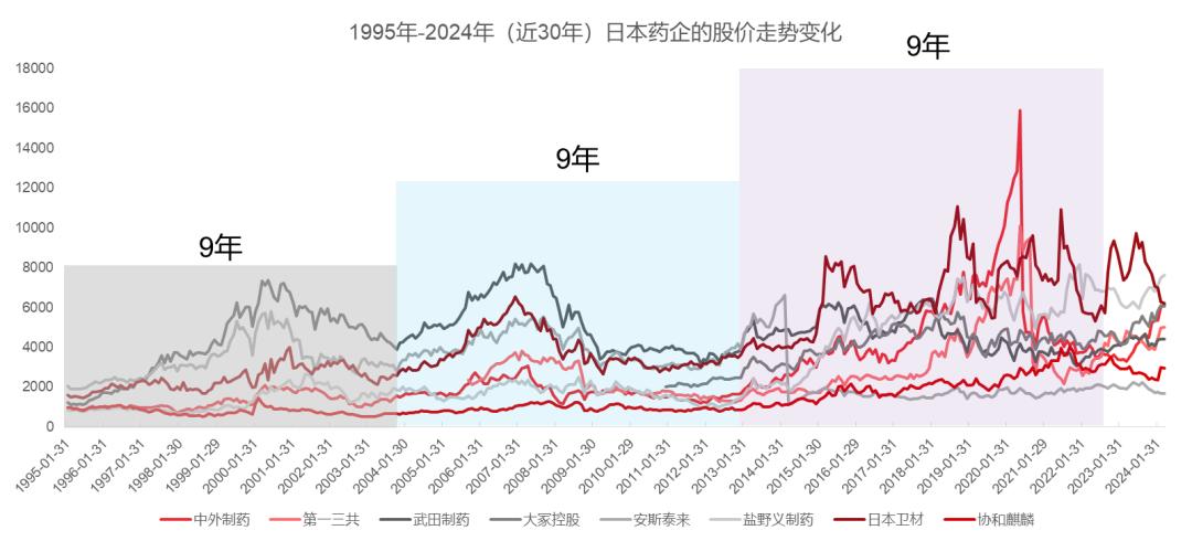 我们选取了1995-2024年近30年间日本TOP8的药企,观察它们的股价走势,发现可以分为三个小的周期波段,每个波段时间是9-10年。